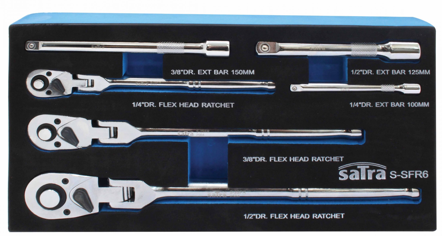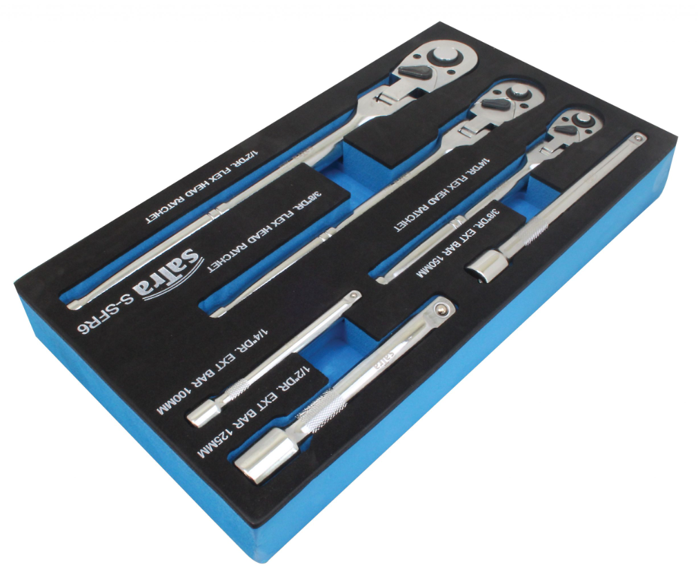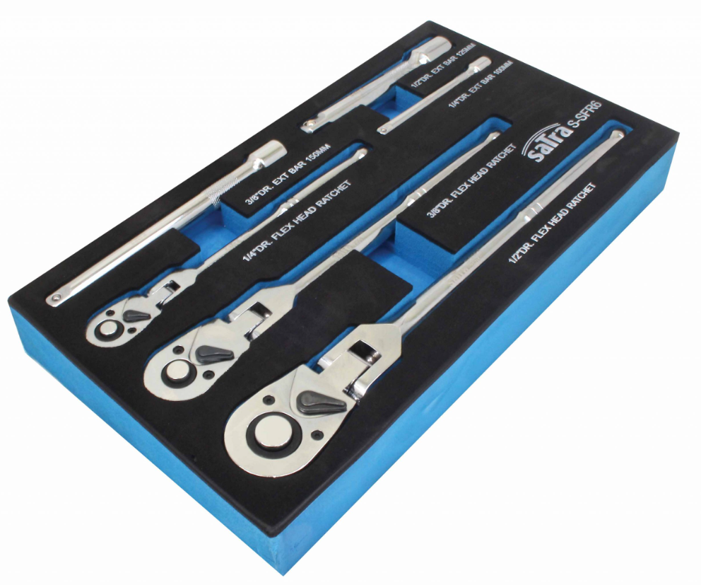 6-częściowy zestaw kluczy grzechotkowych na przegubie i przedłużek SATRA ergonomiczną rękojeścią posiadające funkcją szybkiego zwalniania.
