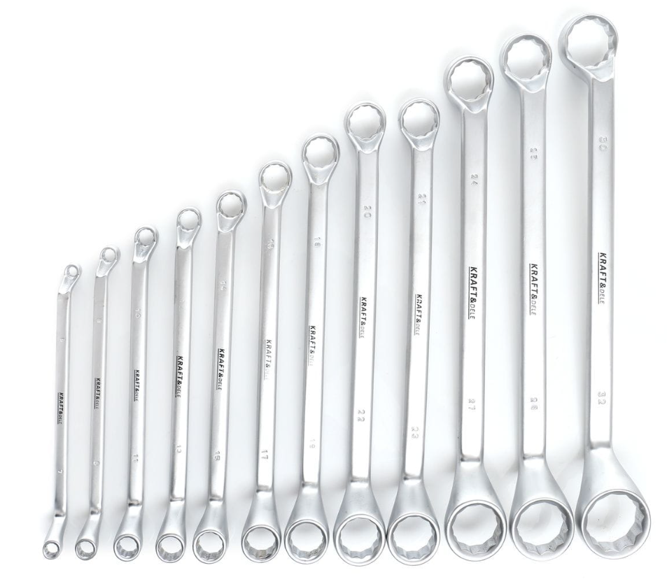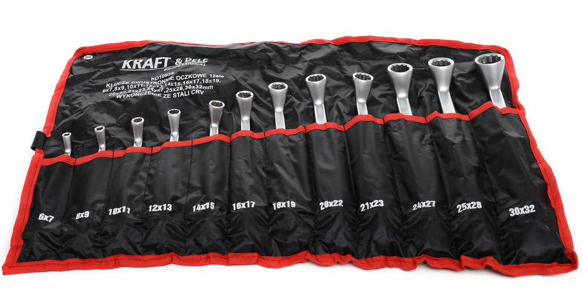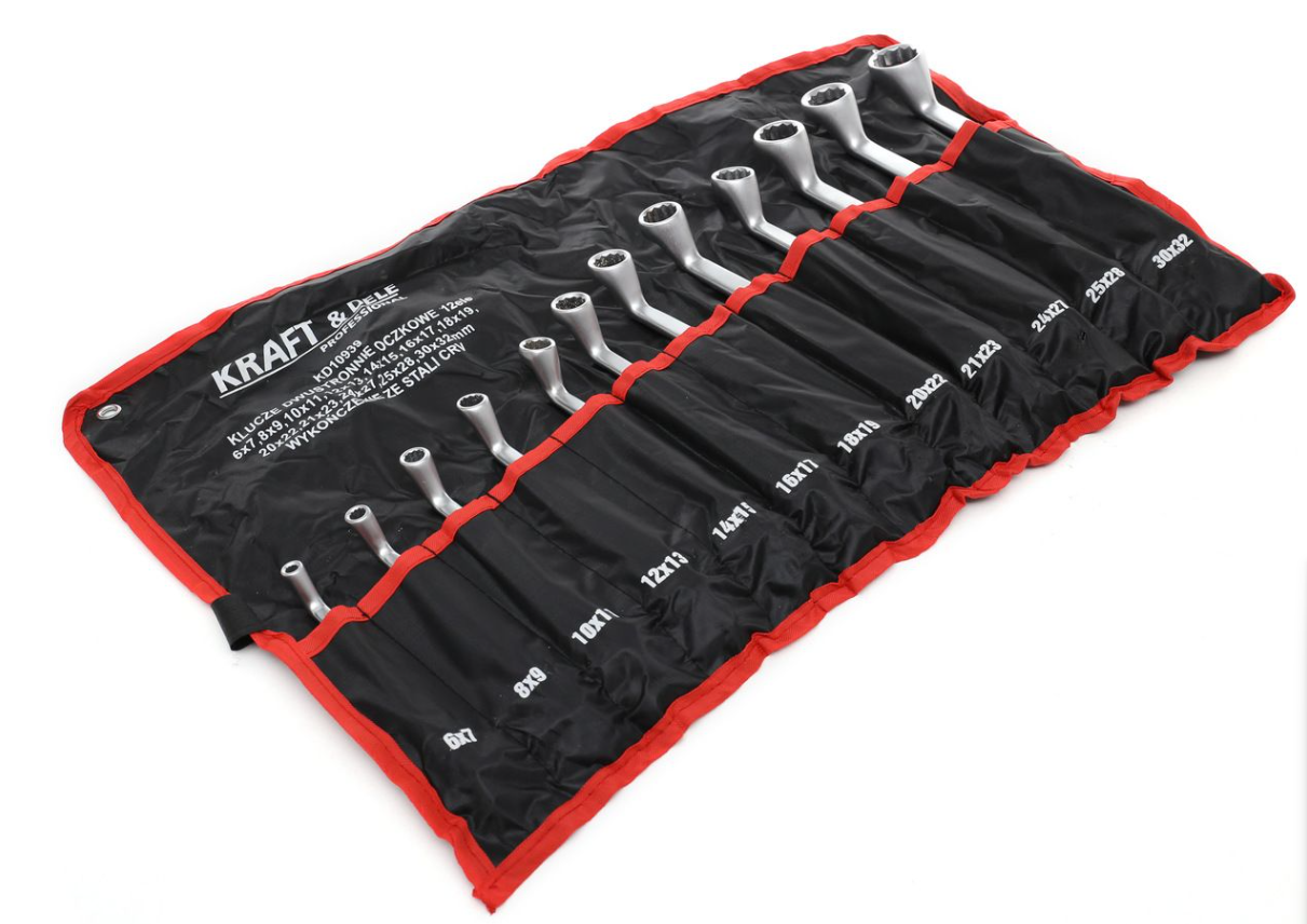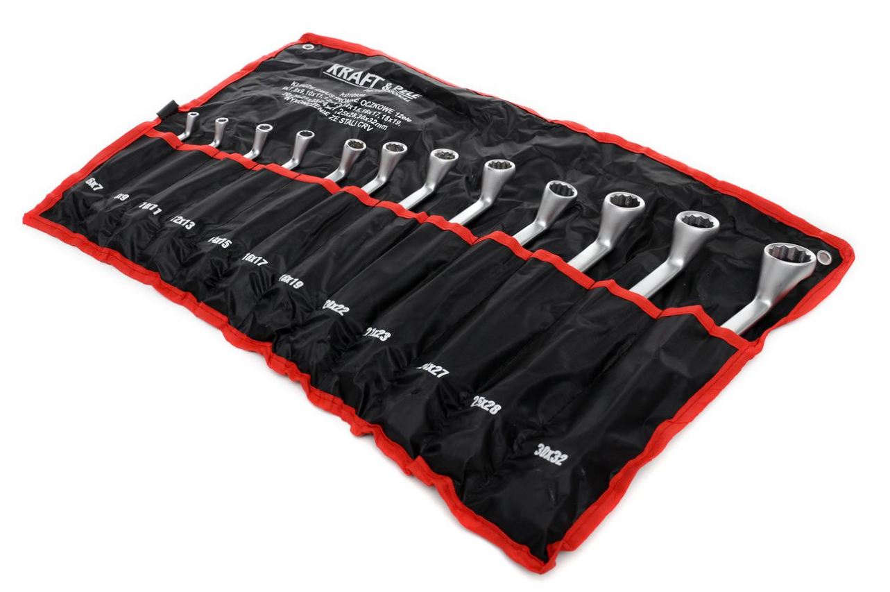 Profesjonalny, 12-częściowy zestaw kluczy oczkowych w różnych rozmiarach. Wykonane zostały z wysokiej jakości stali węglowej chromowanej.