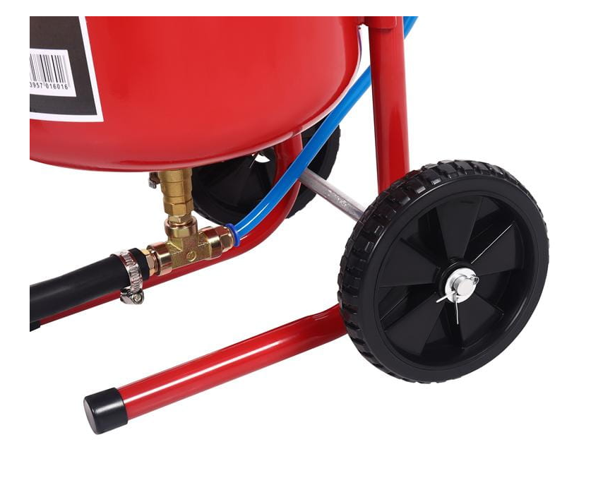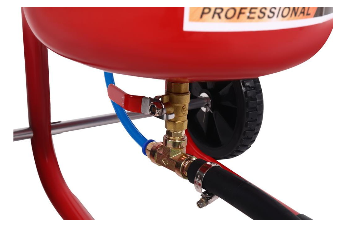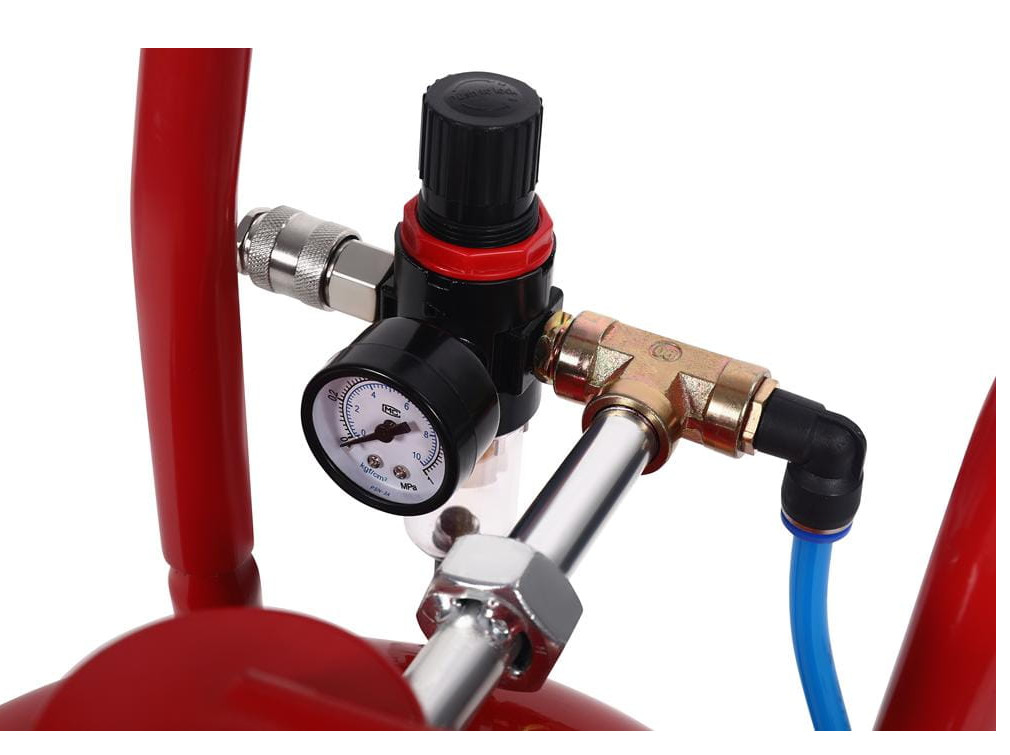 Całość została umieszczona na praktycznym stojaku z kółkami, który umożliwia wygodne przemieszczanie urządzenia. Zestaw wyposażono również w niezbędny wąż pneumatyczny, który pozwala szybko podłączyć urządzenie do kompresora.