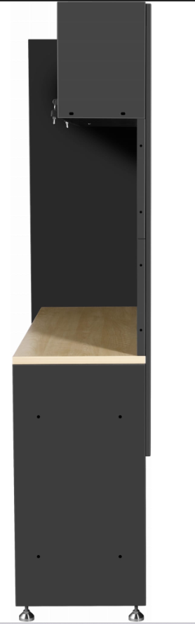 Zestaw obejmuje dużą szafę z półkami, szafę dolną z półką, szafę dolną z szufladami, stalowy panel perforowany oraz blat roboczy o zwiększonej odporności na uszkodzenia. Regulowane nóżki umożliwiają precyzyjne wypoziomowanie całej zabudowy, a lakier proszkowy chroni powierzchnie przed zarysowaniami. Górne szafki wyposażone zostały w podwójne siłowniki gazowe, zapewniające płynne i bezpieczne otwieranie, natomiast dolne szuflady poruszają się na prowadnicach kulkowych, gwarantując komfort i trwałość użytkowania.