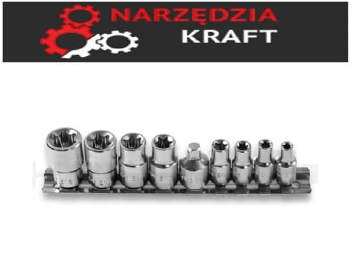 Zestaw zawiera: nasadki 1/4″ (E5/E6/E7/E8), nasadki 3/8″ (E10, E12, E14, E16), adapter